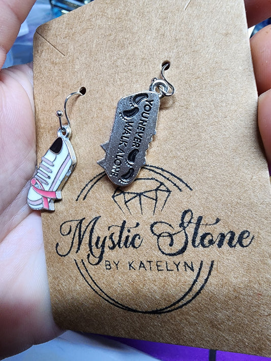 Silver Plated Breast Cancer " you never walk alone" charm style earrings