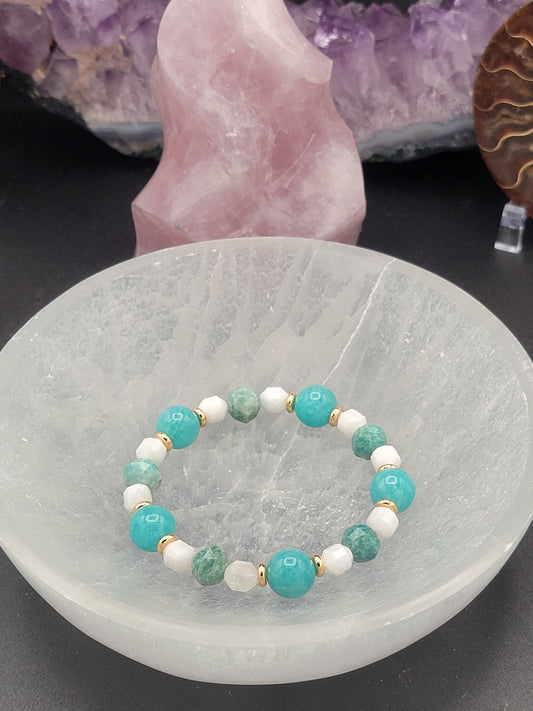 Peruvian Amazonite, white Moonstone & 18k Gold filled beaded stretch cord bracelet