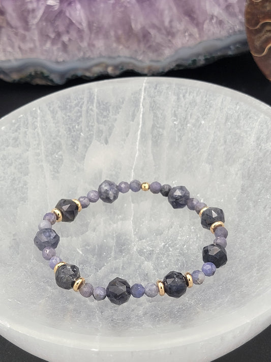 Iolite, Tanzanite and 18k gold filled stretch cord bracelet