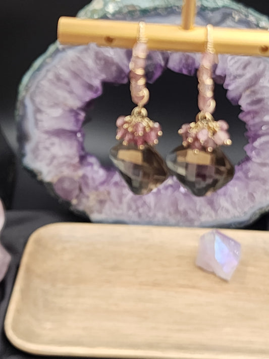 14k Gold-FillednSmokey Quartz & Pink Tourmaline Gemstone Earrings