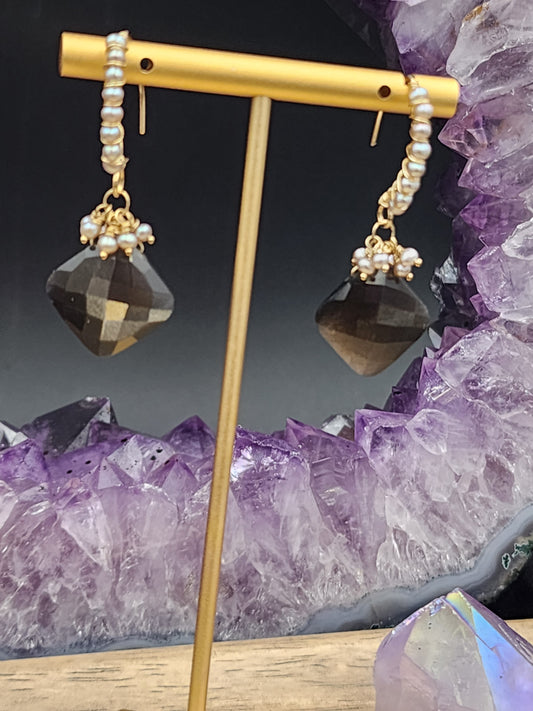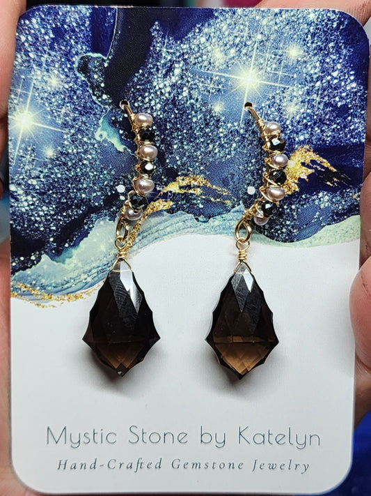 14k Gold -Filled Fancy Cut Smokey Quartz, Silver Freshwater Pearl & Black Spinel Earrings