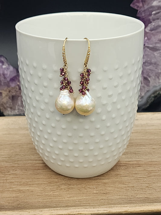 Luxe Flameball Pearl & Rhodonite Garnet Gemstone Earrings with 24k Gold Vermeil French Earwires with Pave Cubic Zirconia