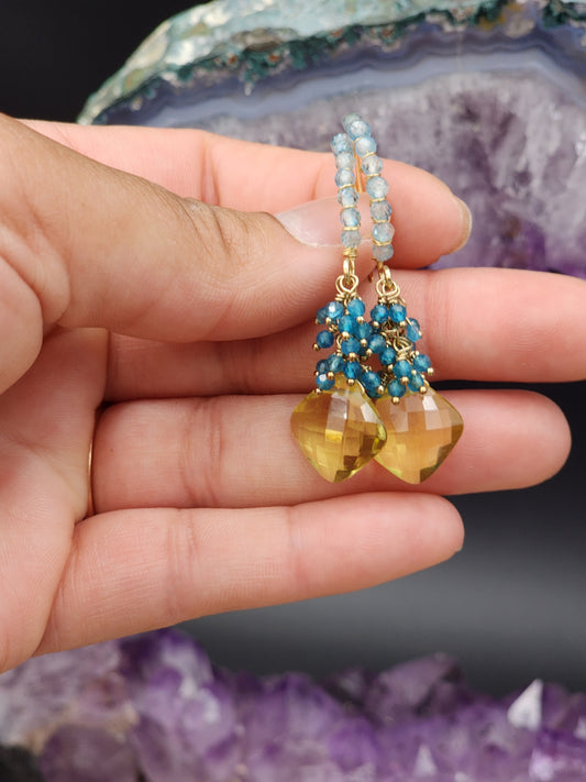 14k Gold-Filled Lemon quartz, neon blue apatite and blue topaz earrings