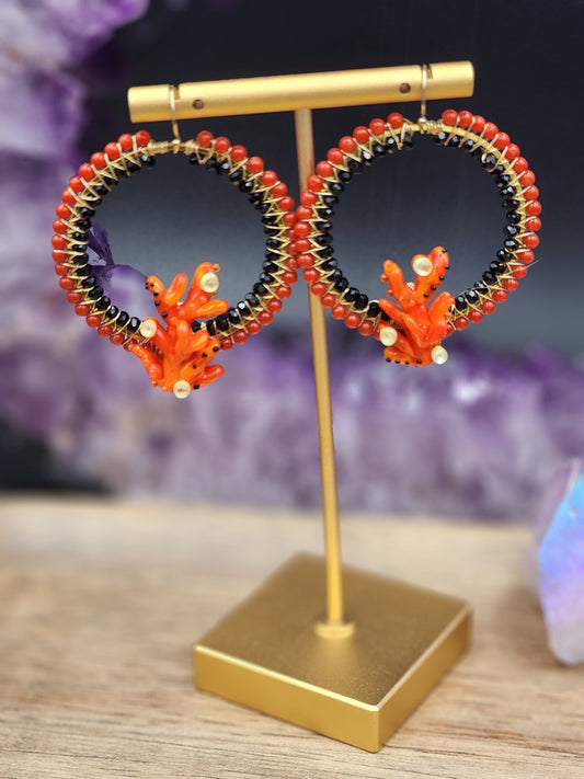 14k Gold-Filled Italian Coral & Black Spinel Gemstone Earrings with lampwork glass coral