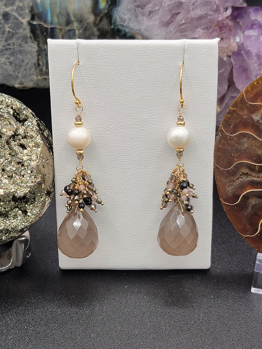 14K Gold-Filled Smokey Quartz, Black Spinel, Pearl, Black tourmaline, Pyrite & Chocolate Moonstone Earrings