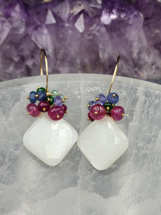 14k Gold-Filled White Moonstone, sapphire and tsavorite Garnet earrings