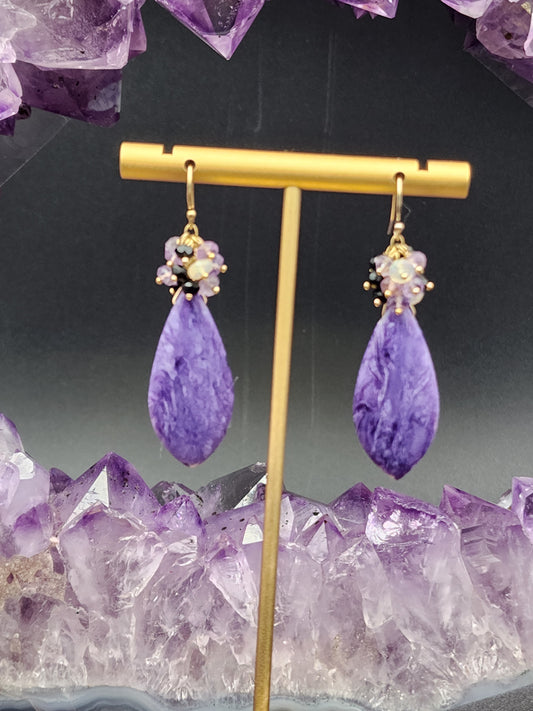 14K Gold-Filled Charoite, Black Tourmaline, Opal & Lavender Amethest Gemstone Earrings