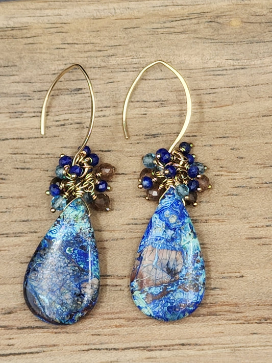 14k Gold-Filled Neon Azurite Malachite, Andalusite, Sweet Blue Topaz & Lapis Lazuli Gemstone Dangle earrings. One-of-a-kind earrings
