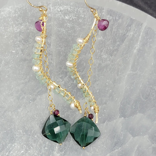 14k gold-filled Columbian Emerald, Freshwater Pearl, Rhodonite Garnet & Emerald Green Hydro Quartz Gemstone Earrings