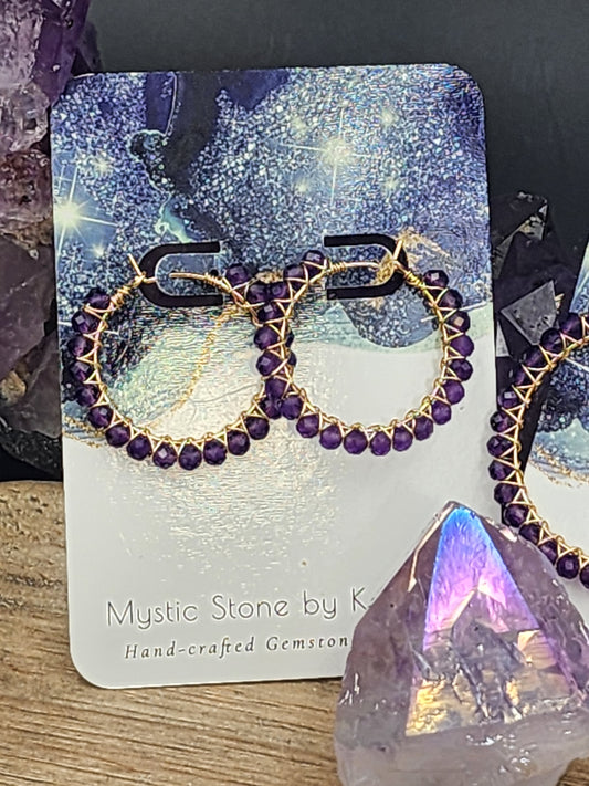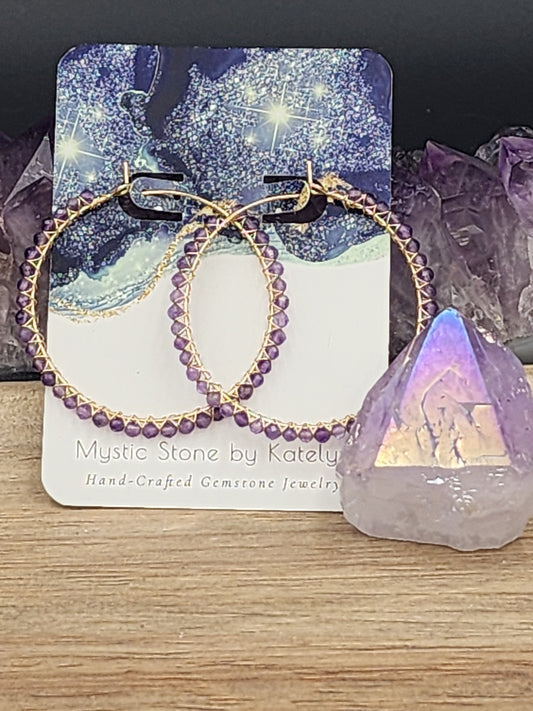 14k Gold-Filled Deep Purple Amethyst Gemstone Hoop Earrings, two sizes 30mm or 40mm diameter