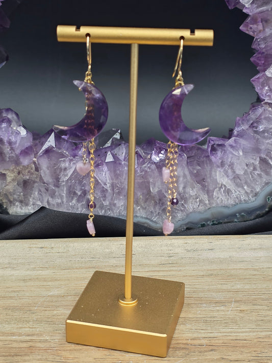 14k Gold-Filled Amethyst Moon Earrings with Lepidolite Hearts custom order for Becca