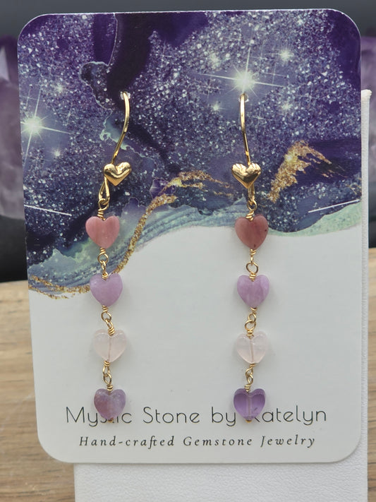 Amethyst, Rhodonite, Lepidolite & Rose Quartz Gemstonr Heart dangle earrings