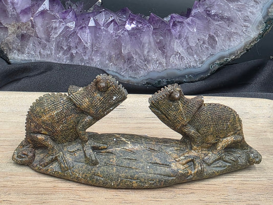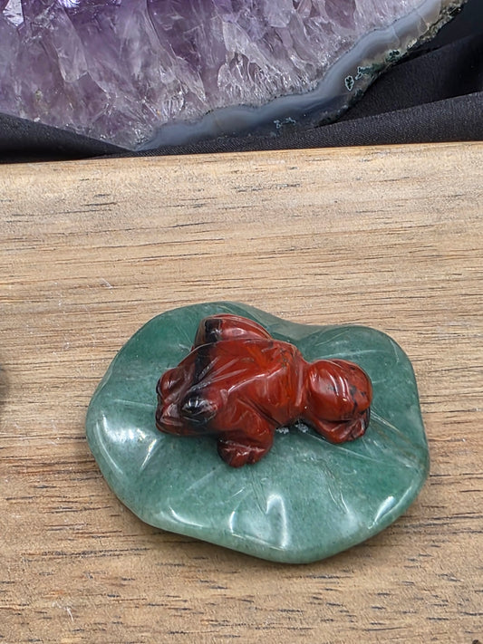 Lily Pad Frog Carvings, Red Jasper or Obsidian Frog on a Green Aventurine Lily Pad