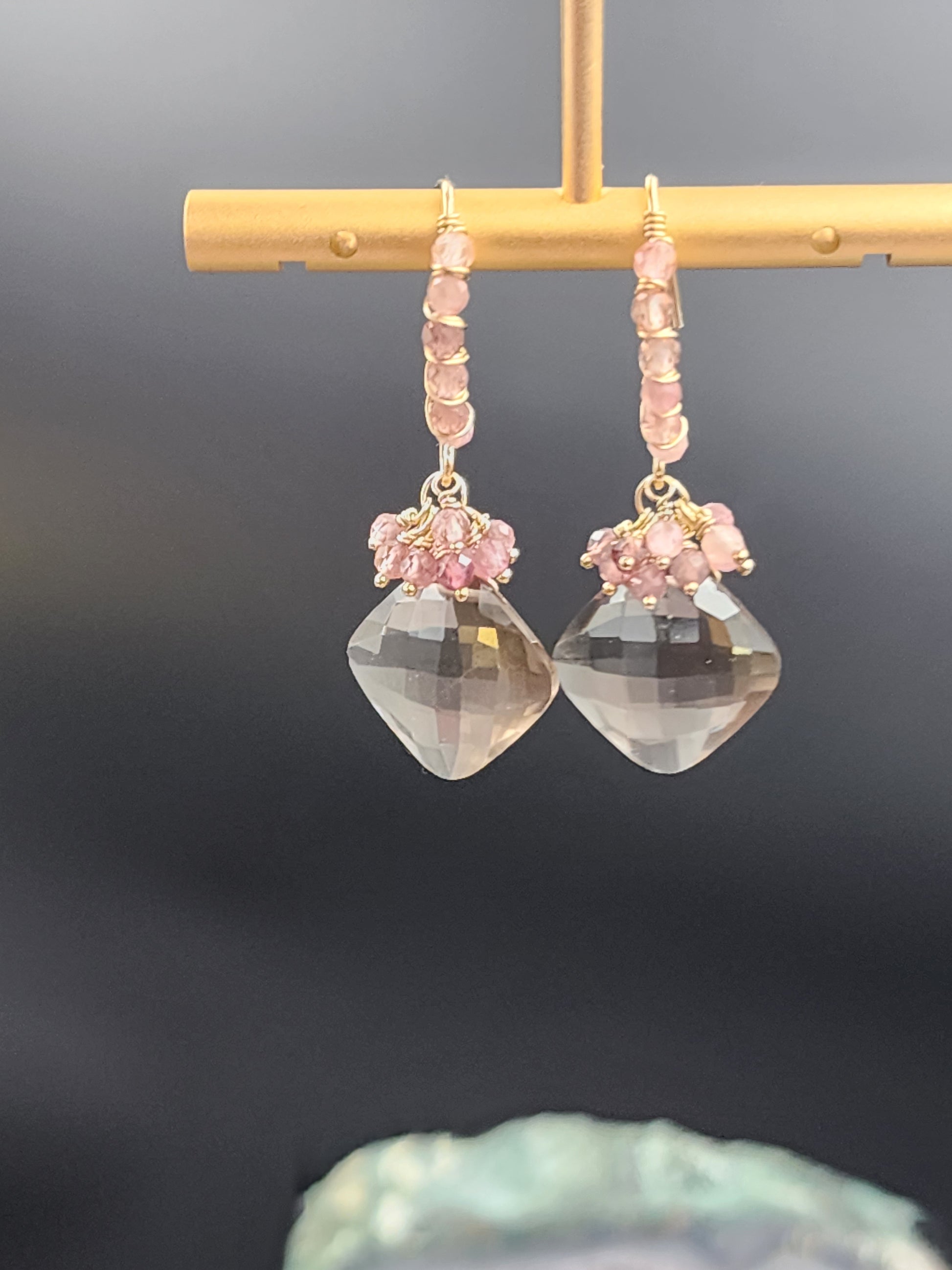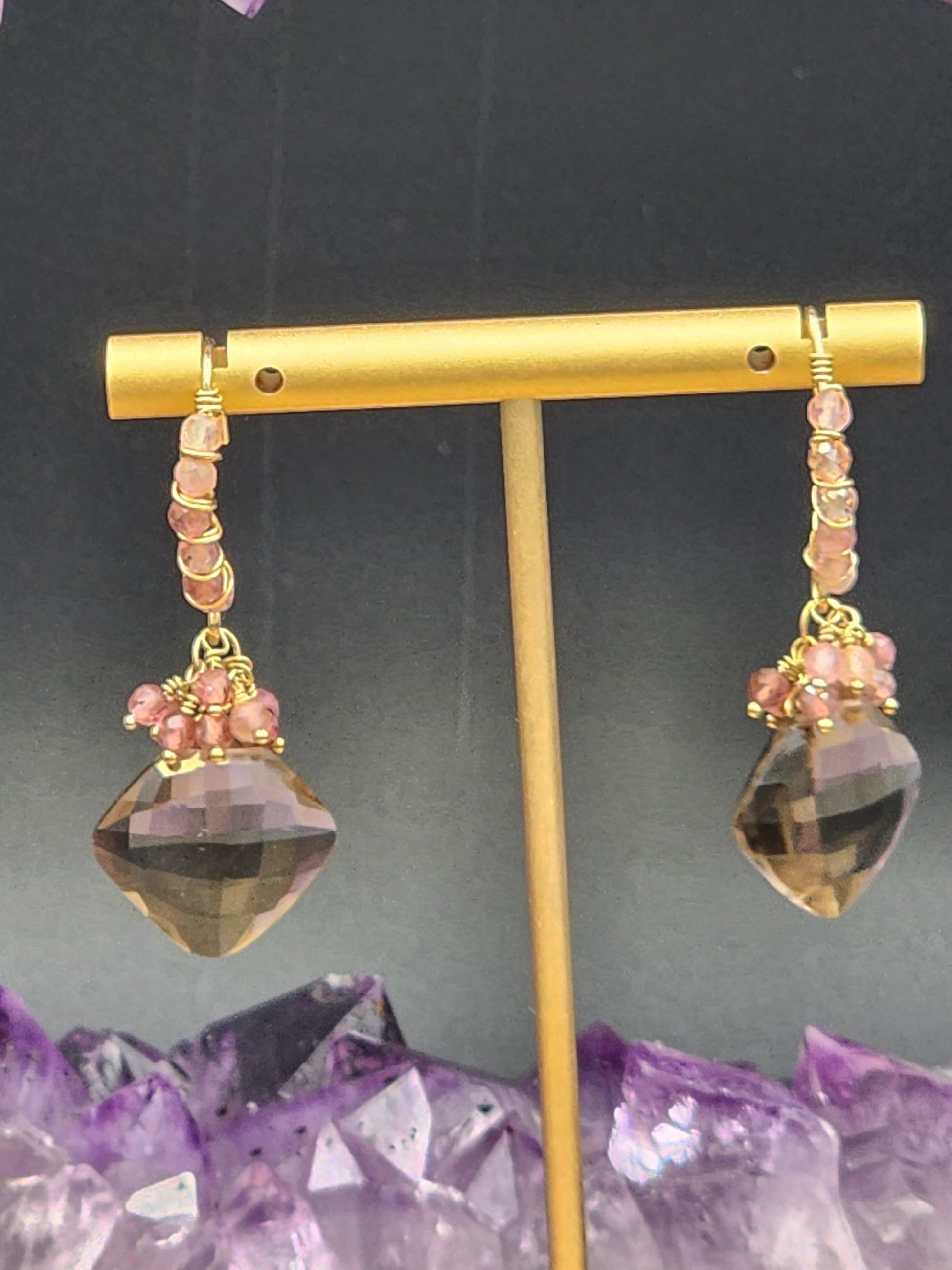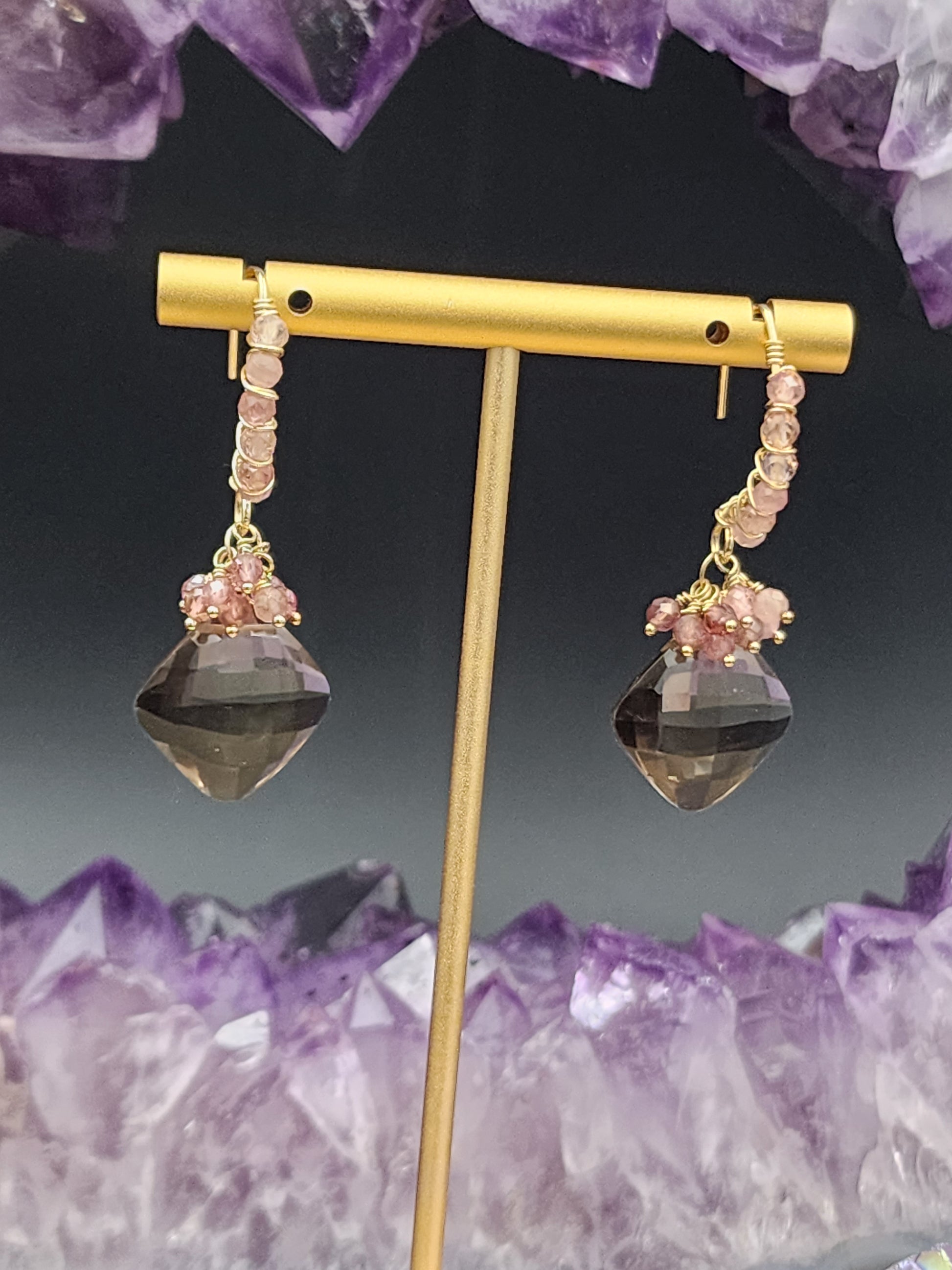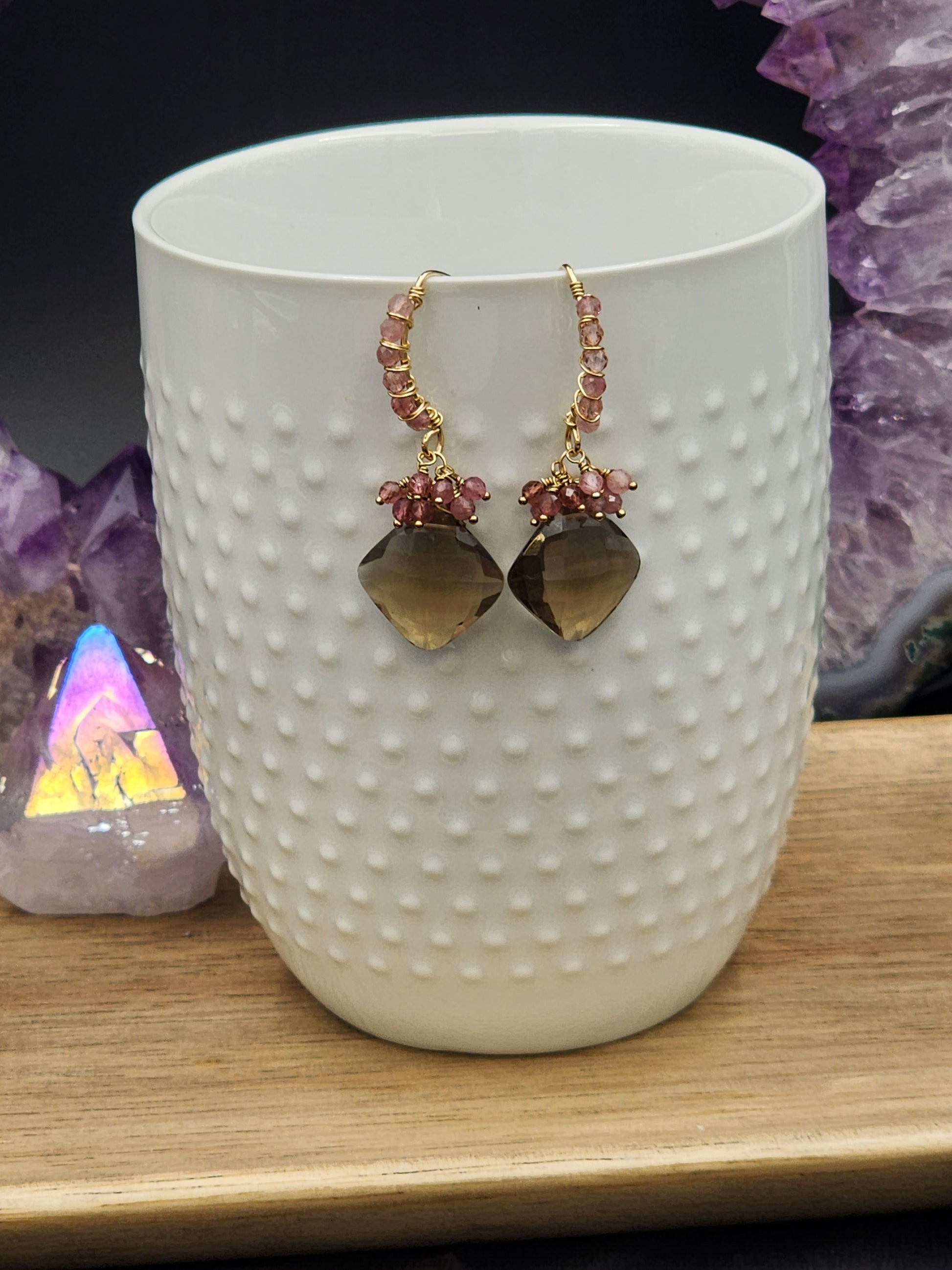 14k Gold-FillednSmokey Quartz & Pink Tourmaline Gemstone Earrings